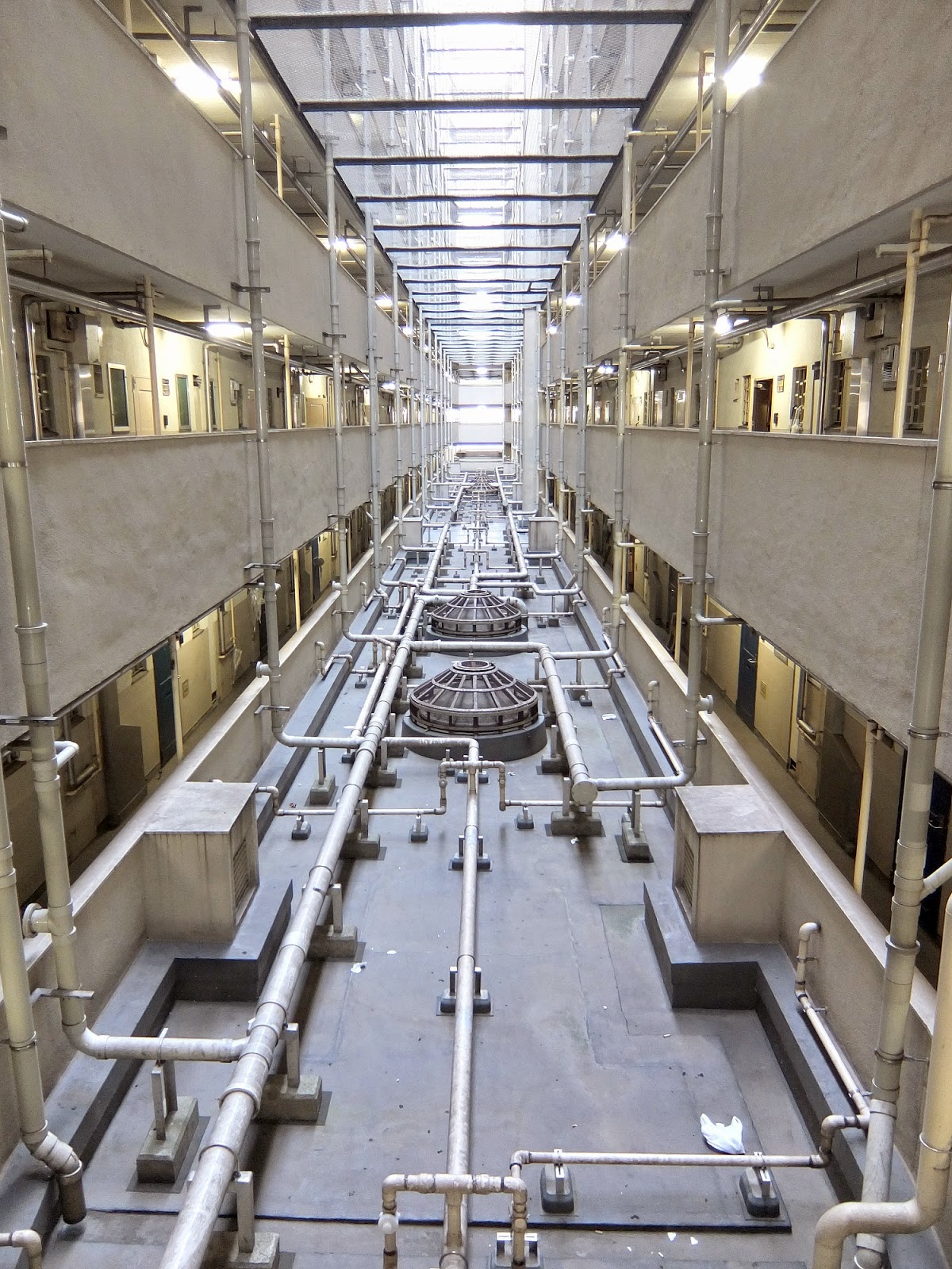 階段室から廊下まで、開口部の隅々にまで取り付けられているフェンスは、「自殺の名所」と呼ばれた時代から脱却するための苦肉の策でした。